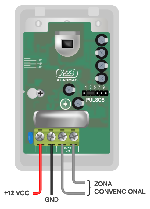 7Conectá los bornes de alimentación (+ y -) a una salida de alimentación de sensores activos de la central de alarma.