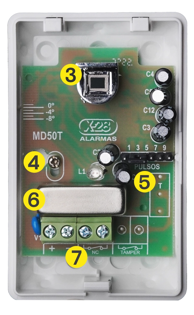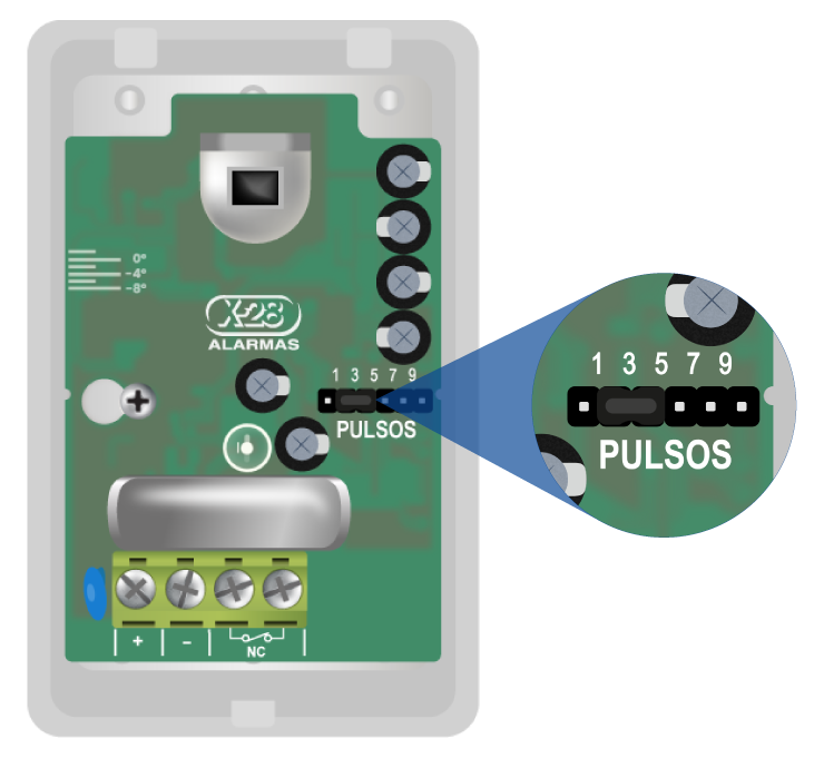El MD 50R ofrece la opción de ajustar el número de pulsos que el equipo debe detectar antes de generar una señal de alarma. Para configurar esta prestación, el sensor cuenta con un jumper que puede ubicarse en 5 posiciones distintas: de 1 a 9 pulsos. Simplemente, colocá el jumper en la posición deseada, como se observa en la imagen a continuación.