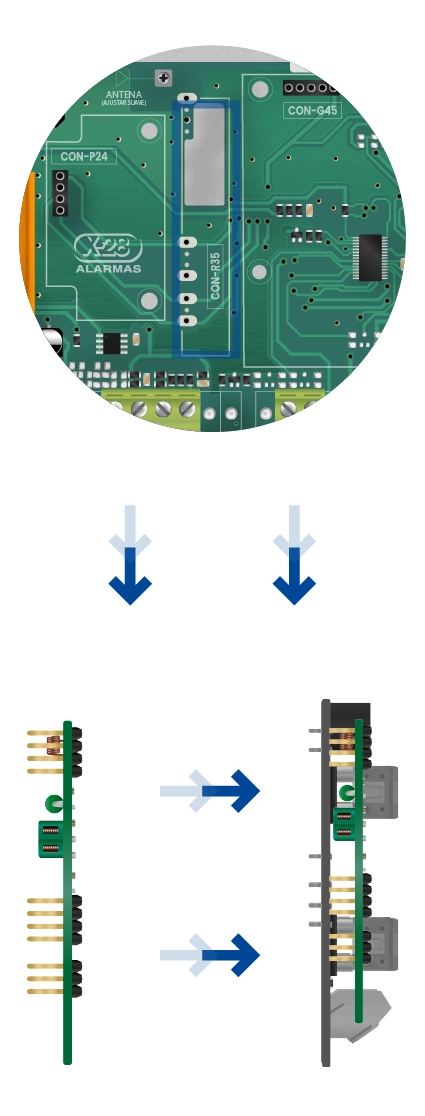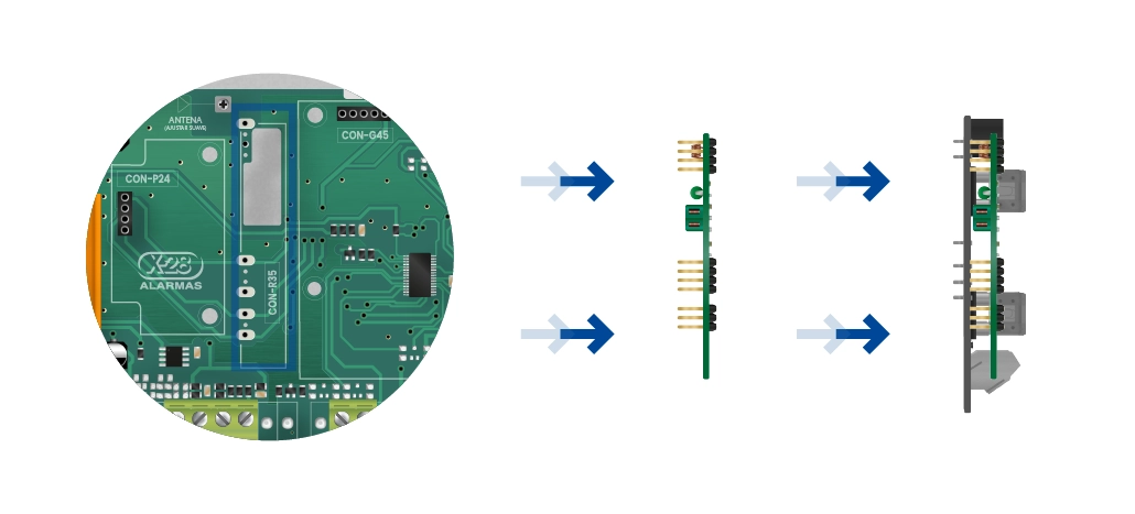 - 3 Colocá la placa MPIBEEPR RC-MPXH en el CON-R35 de la central.