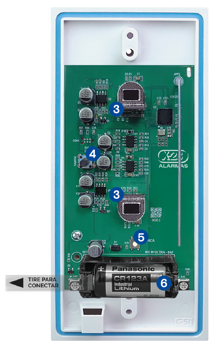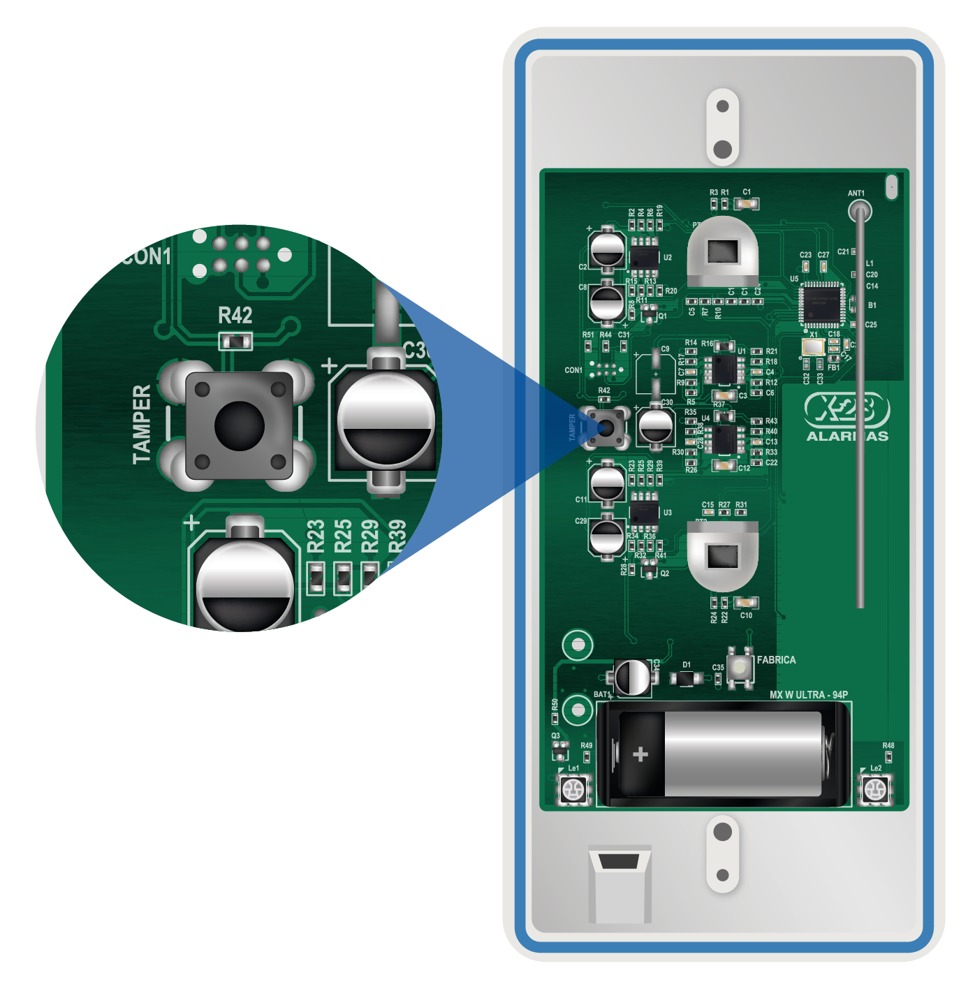 El MX W Ultra está equipado con un switch de tamper que funciona como un mecanismo antisabotaje. Si la tapa del equipo se abre, incluso cuando la central está desactivada, el sensor generará un evento de sabotaje y disparará el sistema de alarma para alertar sobre la situación.
