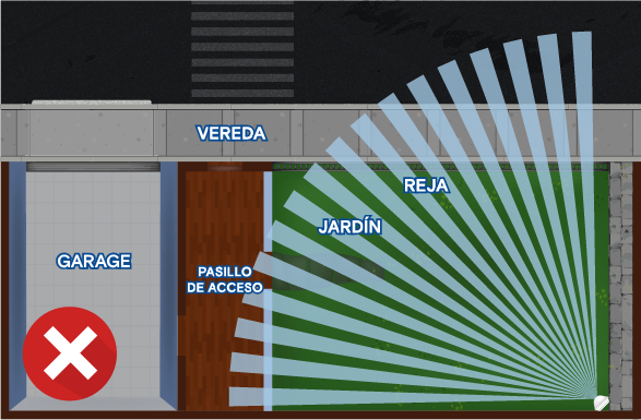 - 2No apuntes el detector hacia zonas externas ajenas a la propiedad. Si lo instalás en el frente de una casa, asegurate de que todos los haces queden dentro de los límites de la propiedad y nunca lo orientes hacia la calle.