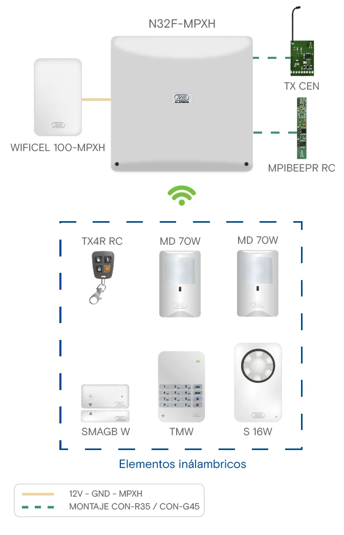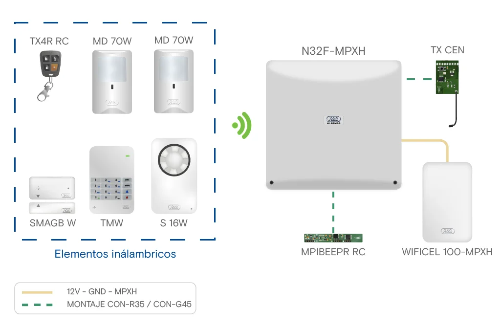 Central de alarma full MPXH de 32 zonas, ampliable a 256 (8 particiones de 32 zonas), con zócalos plug-in integrados para conexión de equipos inalámbricos y de comunicación. Códigos personales para 30 usuarios (expandible a 240) y registrador de eventos.
