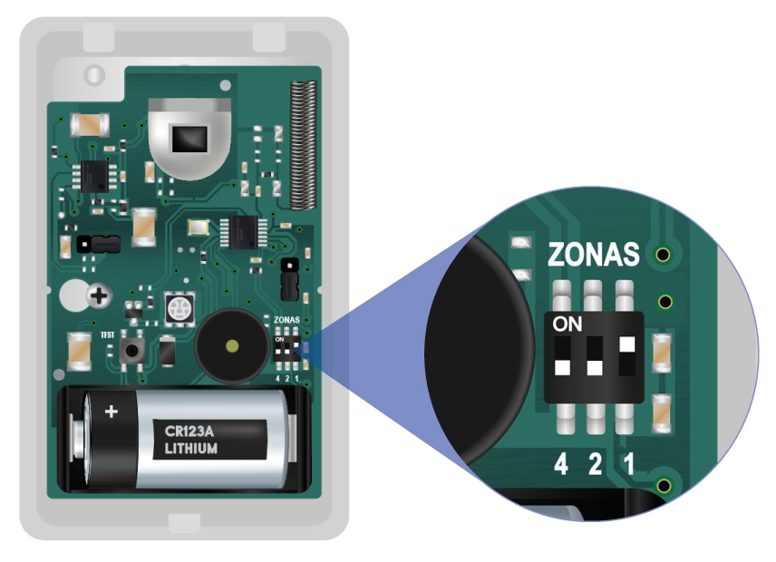 Detector infrarrojo compatible con toda la línea inalámbrica, con procesador digital de señales (DMA), radio de cobertura de 15 metros, incluyendo una zona cero para una protección óptima, compensación térmica inteligente y contador de pulsos programable de 1 a 3.