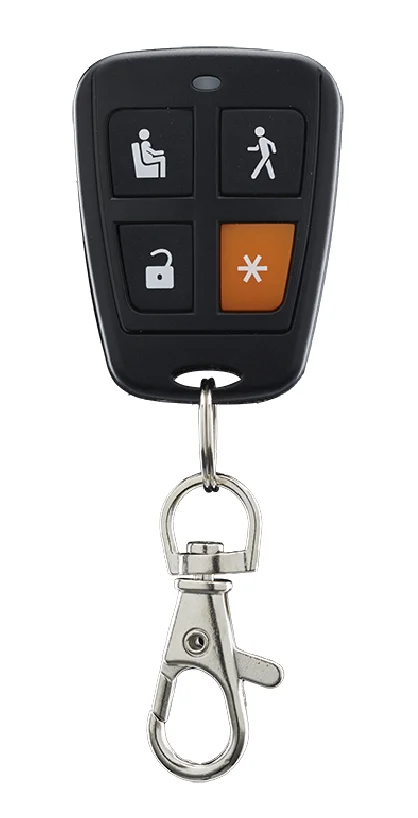 Control remoto registrable de cuatro canales con sistema rolling code. Teclas Estoy, Me voy y Desactivar. Activación silenciosa y botón de pánico.