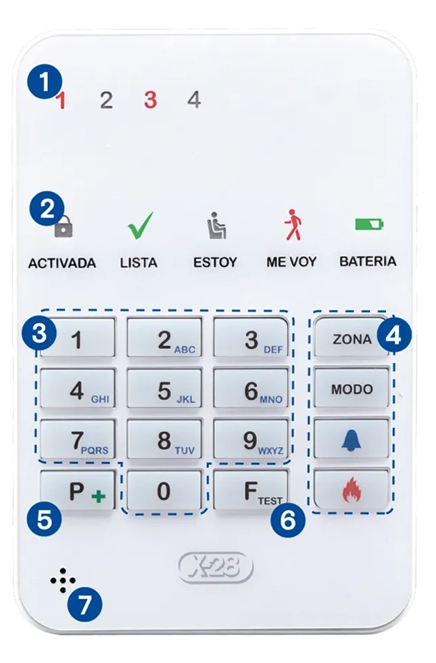 El teclado cuenta con leds individuales que muestran el estado de las zonas 1 a 4, permitiendo al usuario identificar de forma rápida y sencilla qué zona ha activado la alarma o si alguna zona se encuentra abierta o anormal. Además, dispone de indicadores adicionales que brindan información sobre el estado de activación, batería y otras funciones del sistema.